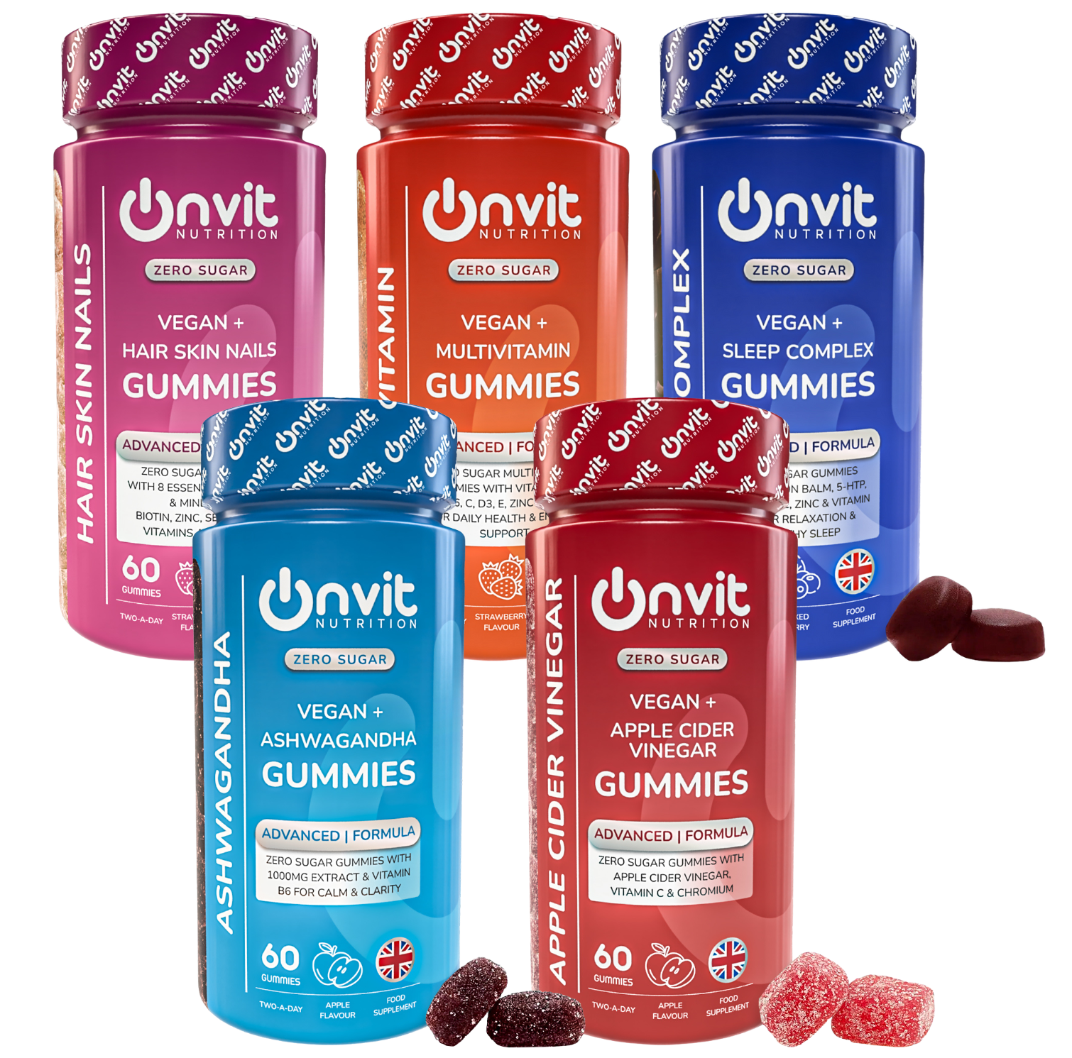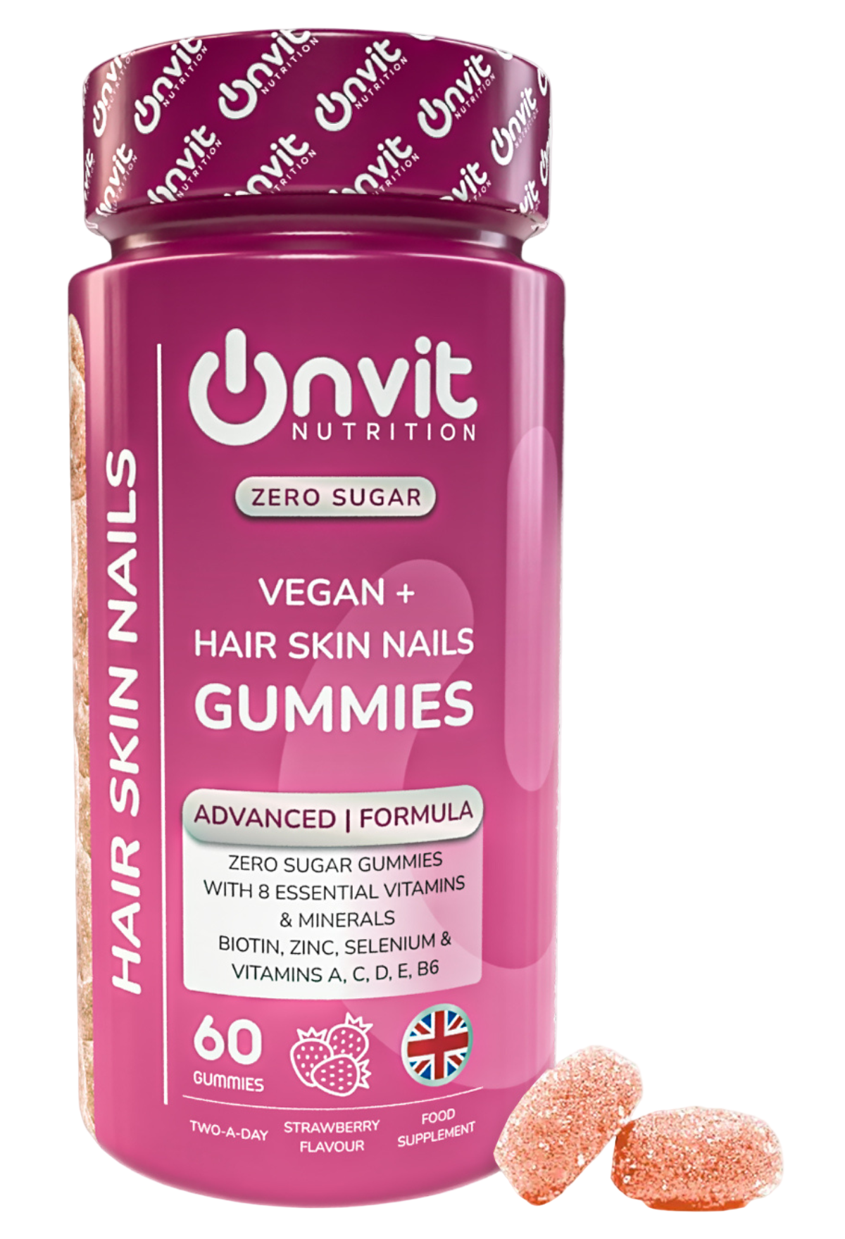OnVit Nutrition Hair, Skin & Nails Gummies combine Biotin, Zinc, Selenium and essential vitamins (A, C, D, E, B6) to nourish your beauty from within. Biotin supports strong hair, Zinc & Selenium maintain normal hair and nails, while Vitamins C & E protect skin and boost collagen formation. Delicious strawberry flavour in a clean, zero sugar, vegan formula for everyday glow.