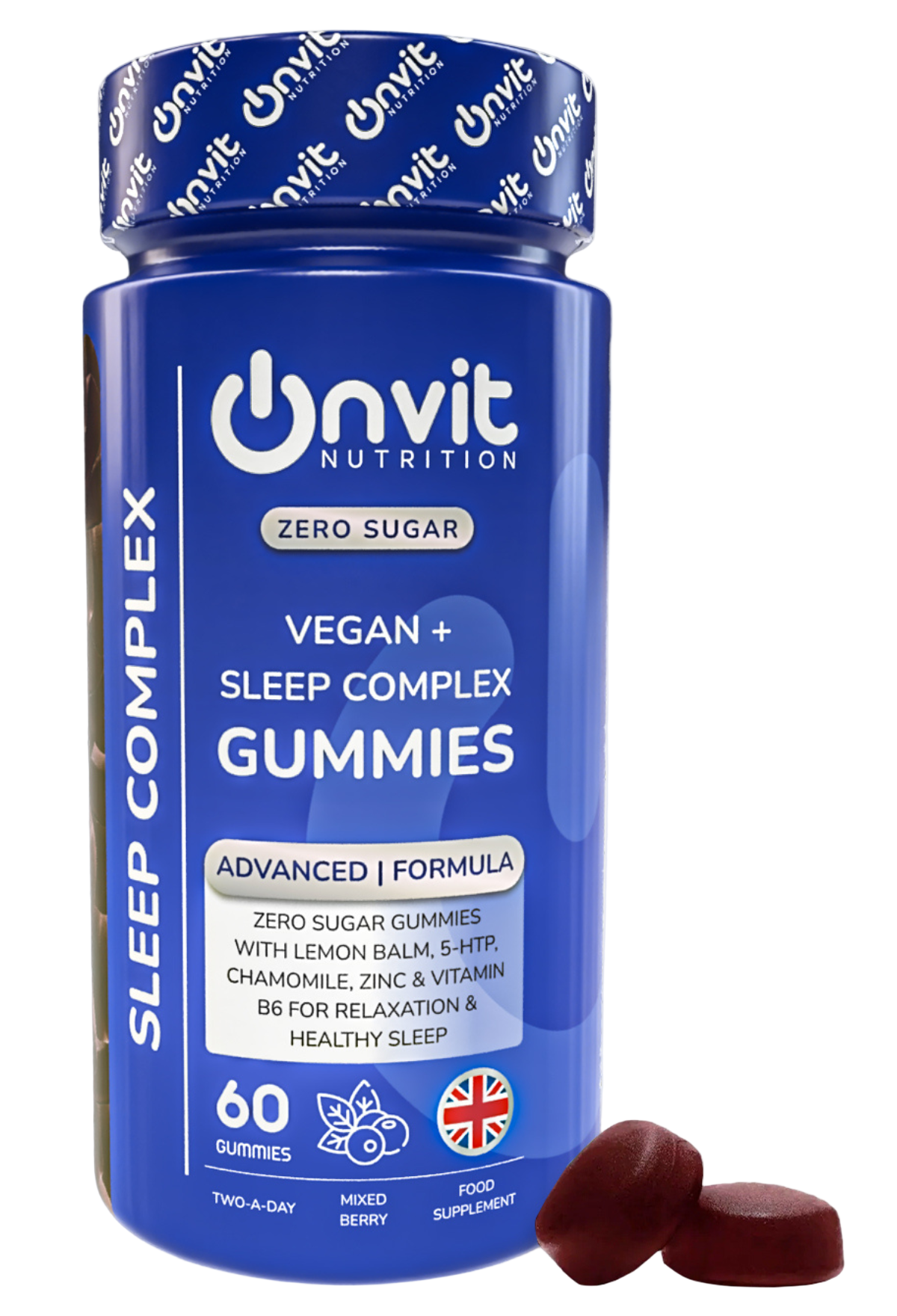 OnVit Nutrition Sleep Complex Gummies deliver a calming blend of 5-HTP, Lemon Balm, Chamomile, Zinc & Vitamin B6 to support restful sleep. 5-HTP naturally boosts serotonin and melatonin levels for better mood balance and healthy sleep cycles. Delicious mixed berry flavour in a vegan, zero sugar formula — for deep, restorative rest.